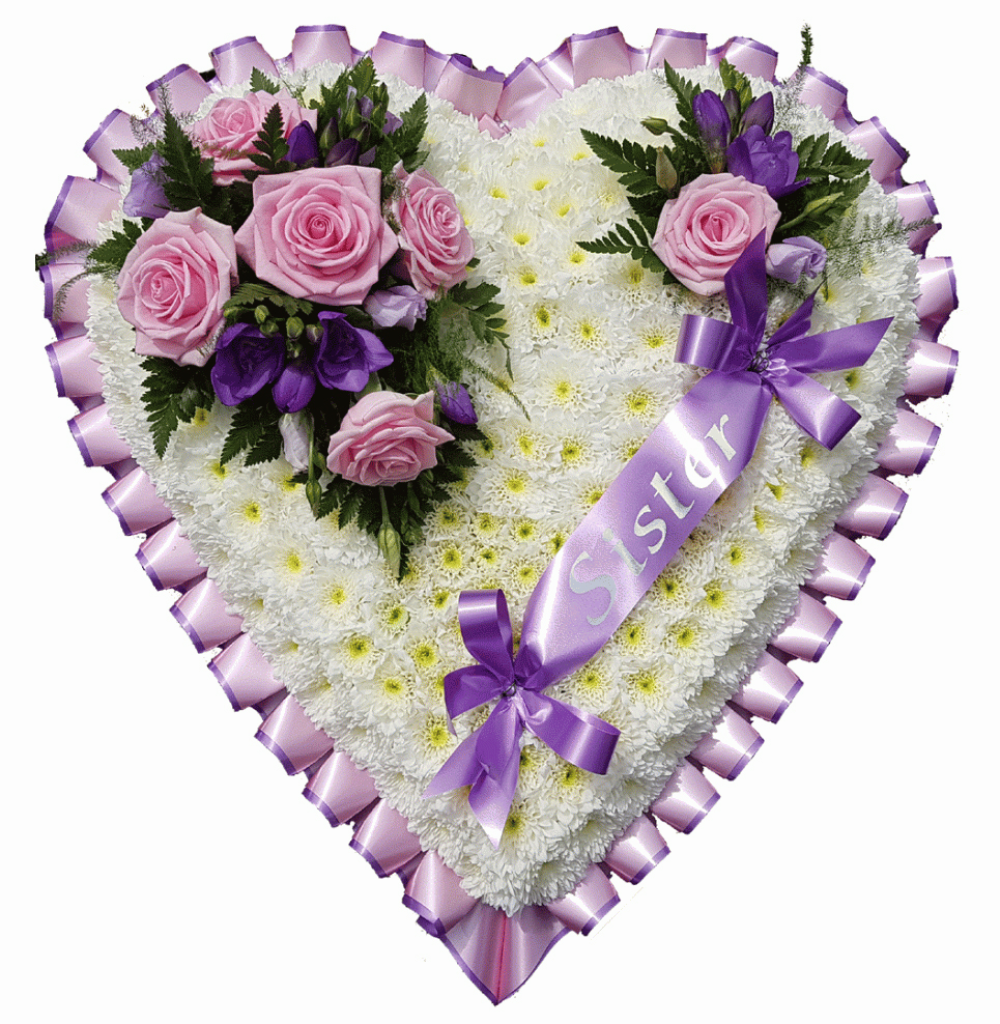A classic heart-shaped design covered with a mass of white double spray chrysanthemums and edged in Pink and lilac pleated ribbon finished with a spray of pink large-headed roses, lisianthus Freesia and foliage. personalised Sister ribbon by Alisons designer florist Maghull Liverpool.